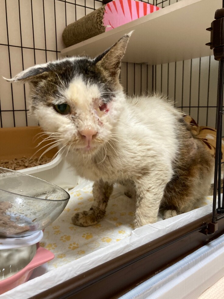 大吉君はとても大変な状態で保護されましたが、いまボランティアさんや獣医さん、応援くださる皆様のおかげで温かいお部屋で美味しいものを食べて過ごせています。