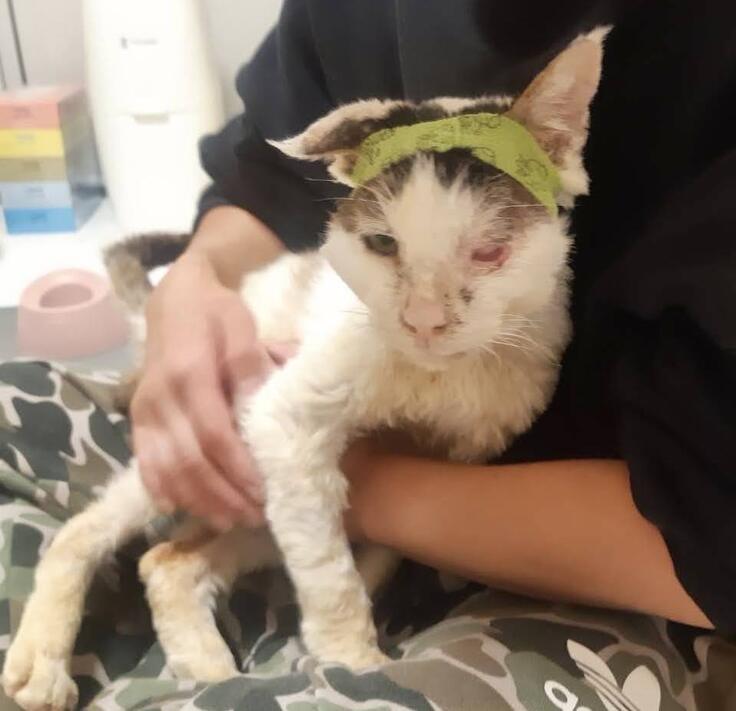 保護した時の大吉君は、エイズキャリア、貧血と飢餓状態、左眼球がなく、耳の骨も曲がったまま固まり、喉には腫瘍ができ膿がたまり、内臓(特に腎臓)の数値もとても悪く、余命3ヶ月と言われました。