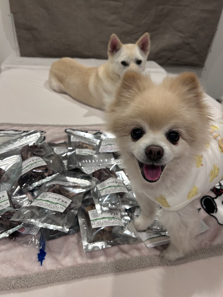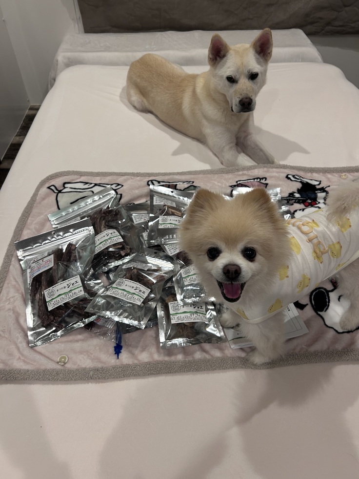 ダンボールから小袋を出してふたりの写真を撮ったわけですが、中身のジャーキーをあげる頃には既に食べられない程、苦しくなっています。