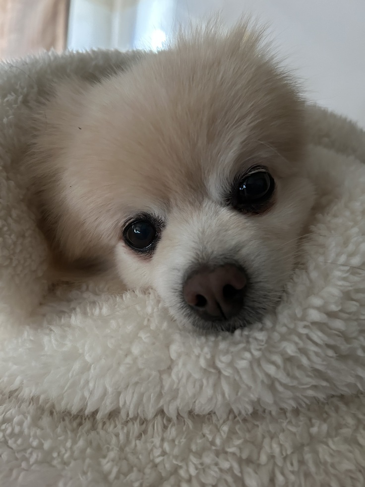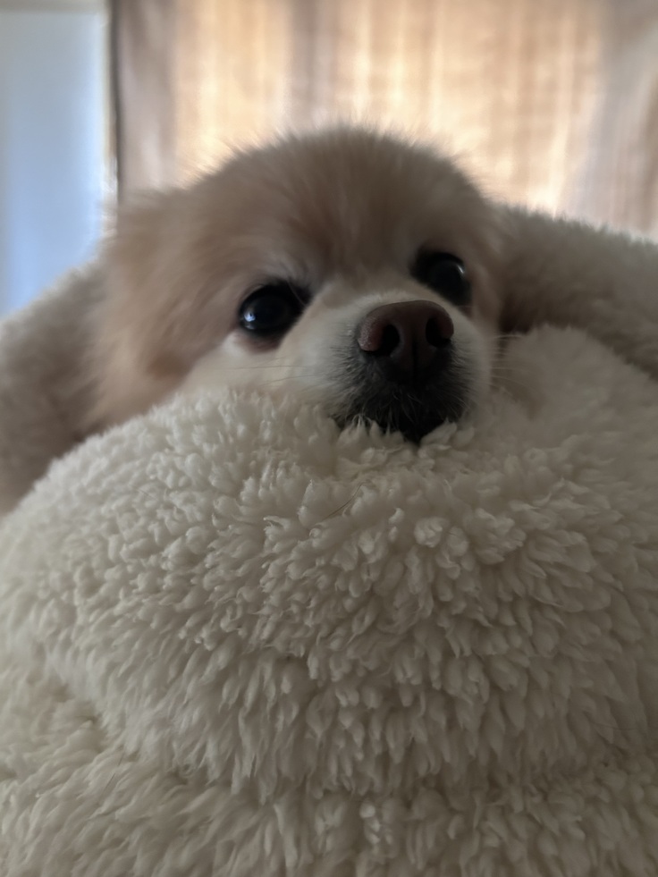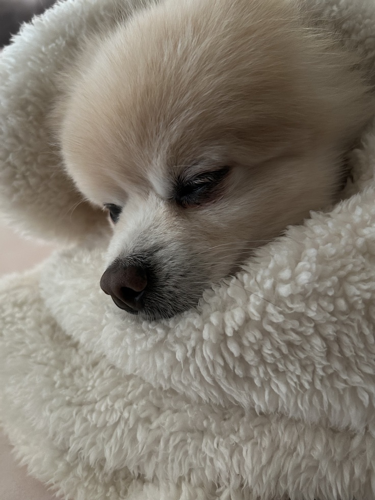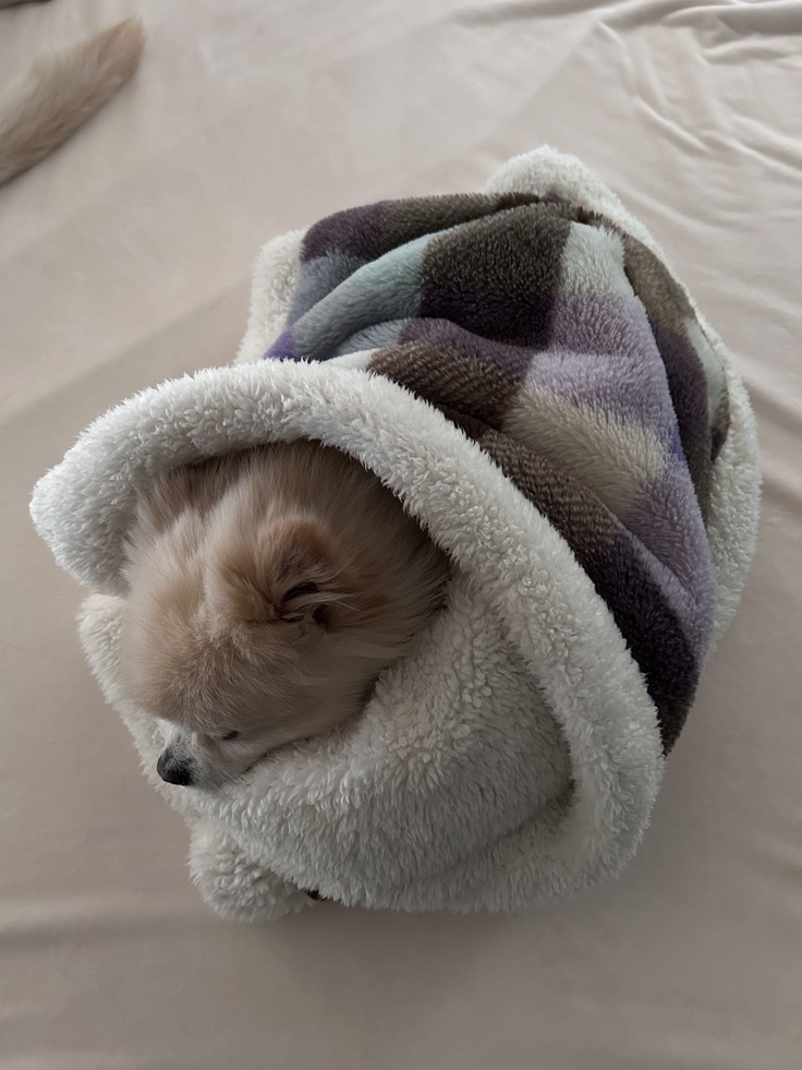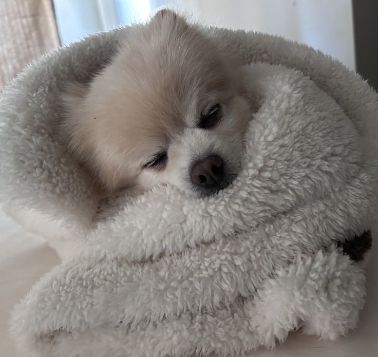 「寝起きにスノーボールの散歩に同行して、朝のトイレを済ませて、朝ごはんのカリカリを食べて、僕は今から昼寝しま〜す!毛布が気持ちいいんだよなぁ〜」