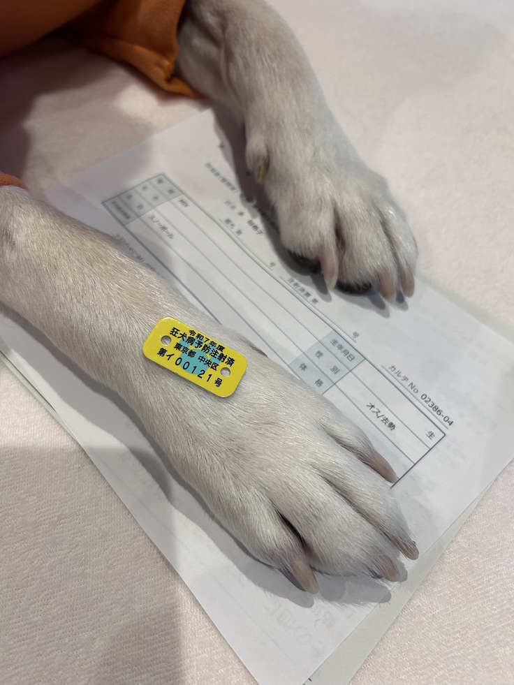 写真は、スノーボールの狂犬病予防注射の接種済票。