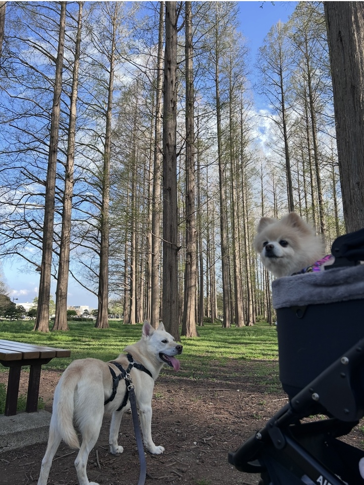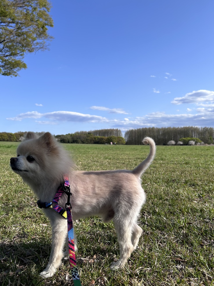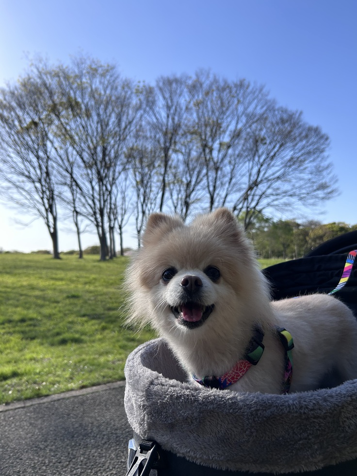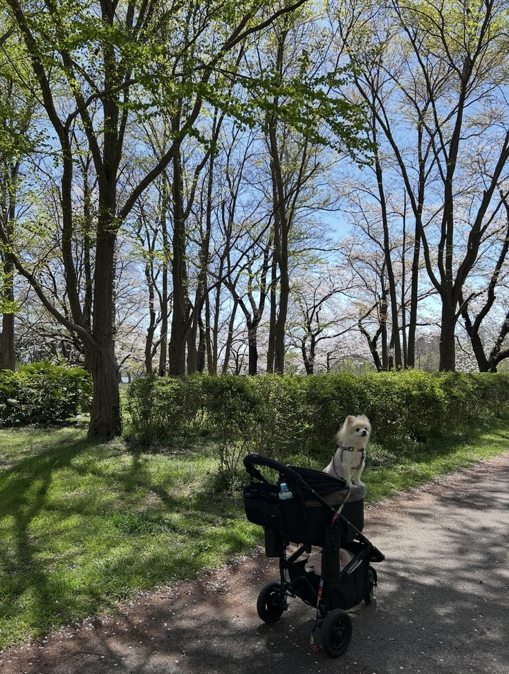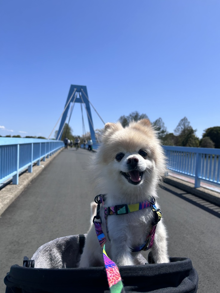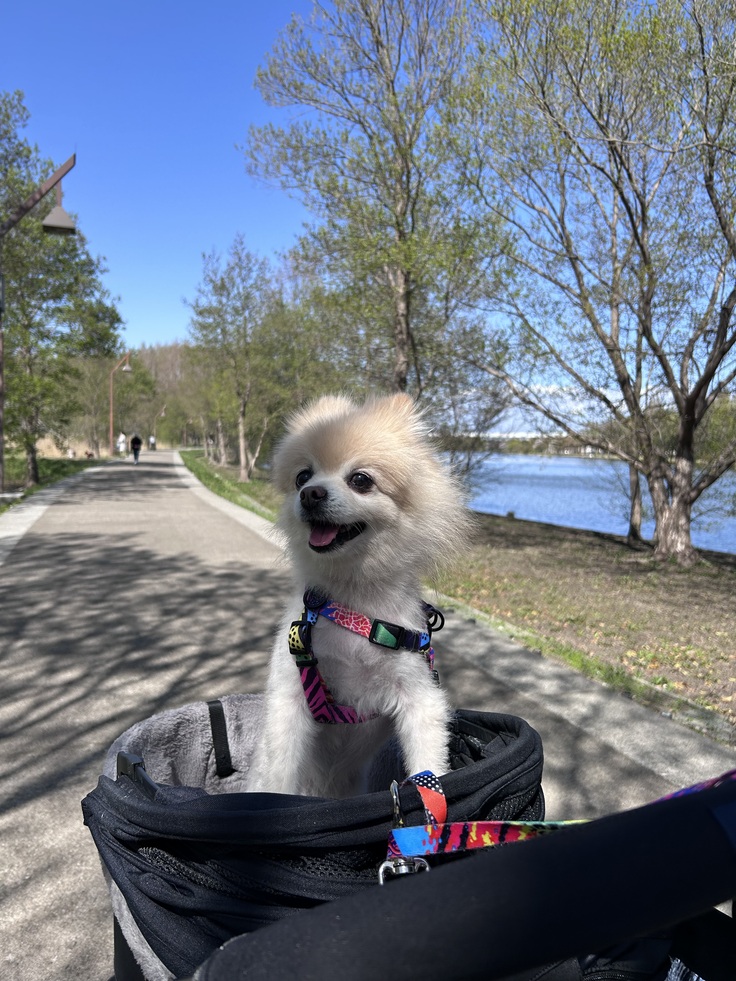 飼い主としては、クッキーが暑くならないように、カートの日除けを使ったり、極力木陰の道を選んだりと、かなり気を遣いましたが、風の助けもあってか、クッキー自身はとても楽しんでいて、全く座っていませんでした。笑