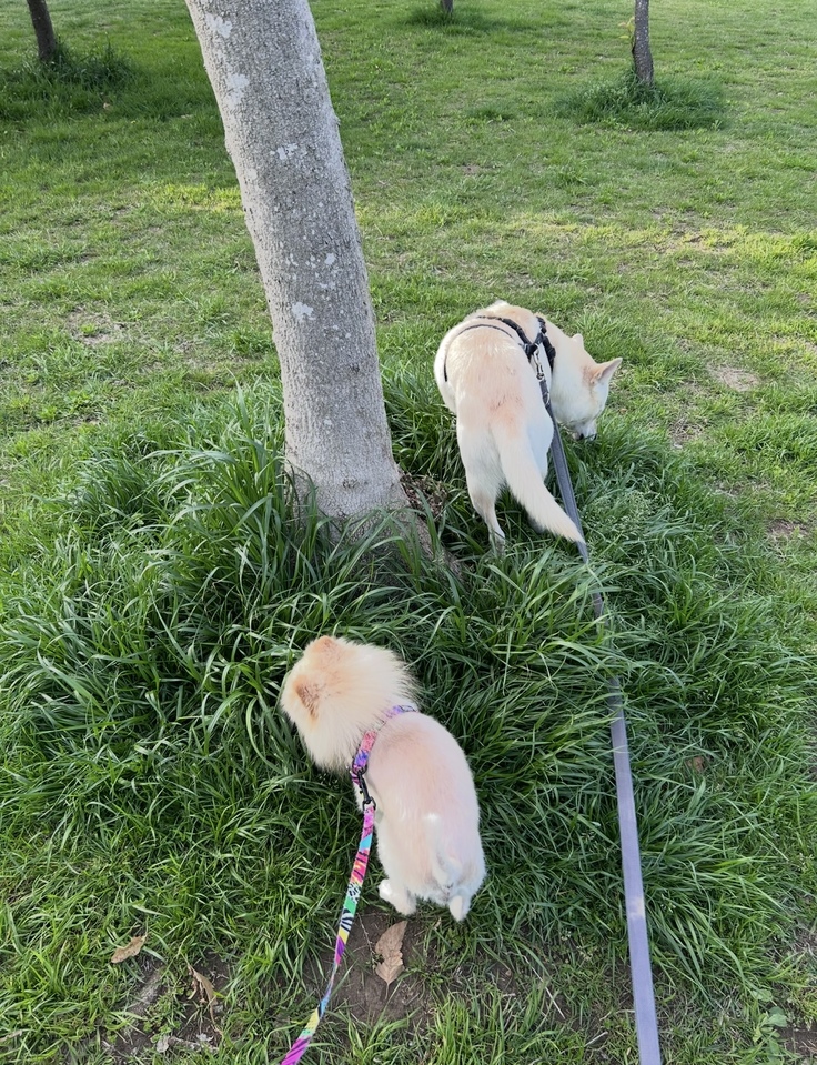 トイレタイムで、クッキーも土と草の感触を楽しみます。