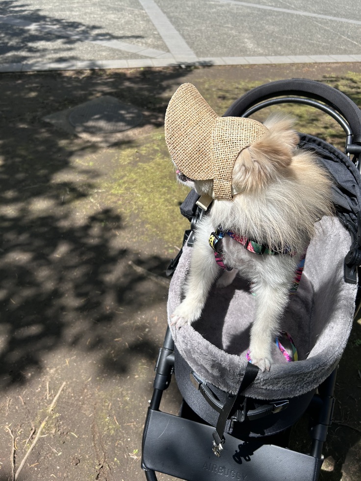 日焼け止めを塗らない私には、お散歩中は、帽子が必須です。クッキーも被っている方が涼しく感じればと思います。