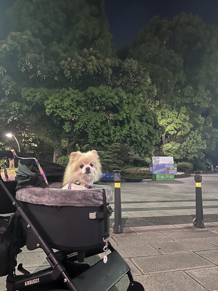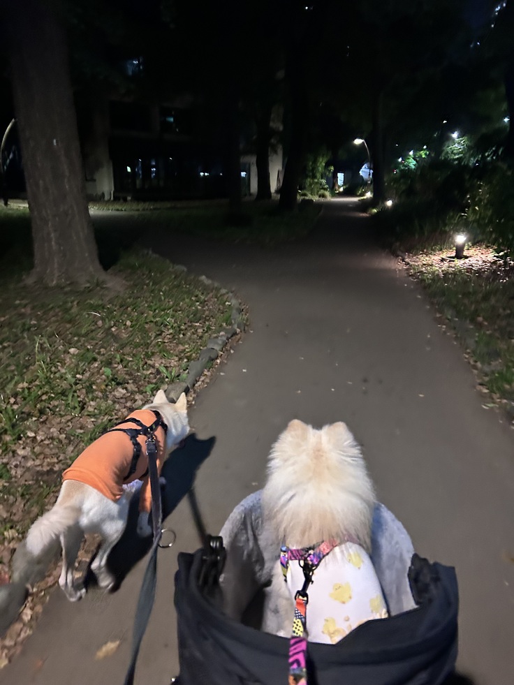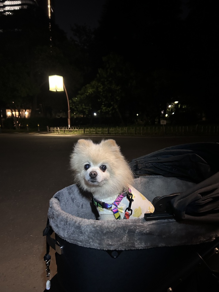 真夜中だからか、日比谷公園で伸び伸びと散歩をスノーボールは楽しんでいましたが、クッキーは普段のように表情や感じが嬉しそうではなくって。