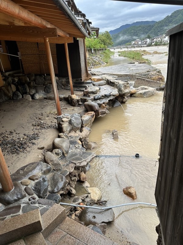 離れた場所にある「巌窟の湯」は、完全に泥水で浸水し、水が引いた後もしばらくは入れない状態でした。
