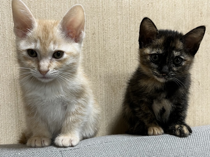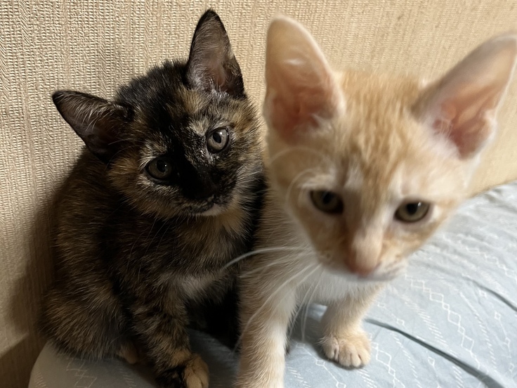 チャビン(茶トラ)とオビン(サビ)はいわゆる混血種の猫です。おそらく2月後半生まれぐらい(詳細は不明です)で、ともにメス猫。