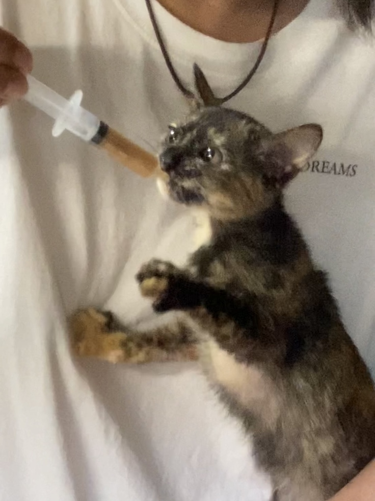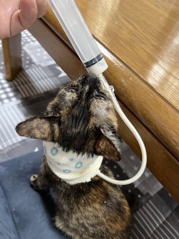 食欲は人一倍旺盛のオビン。食べたい気持ちと噛む力がとても強く、シリンジの先をすぐに潰してしまうので、2回に1回はシリンジを新品にしながらの食事。
