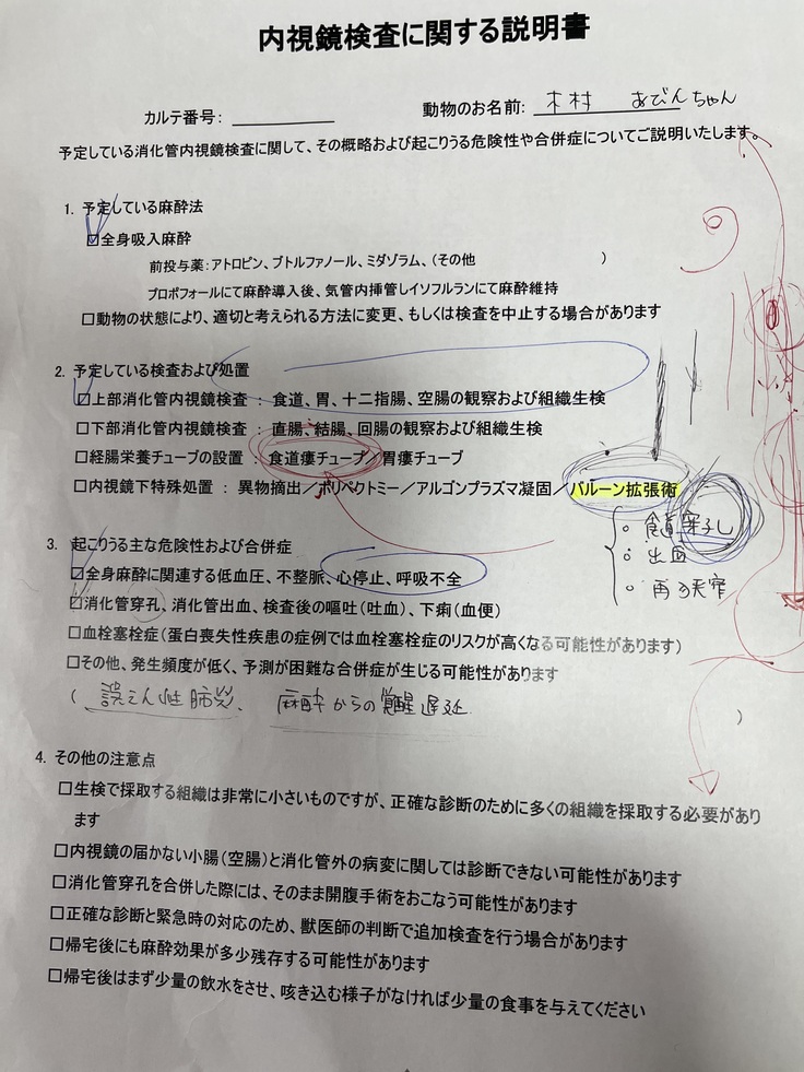 先生方やスタッフの皆様のおかげで、1回目の内視鏡バルーン拡張術は、食道穿孔を起こすことなく全身麻酔からも目覚め、無事に終えることができました。オビンも小さな体でよく乗り越えてくれました!