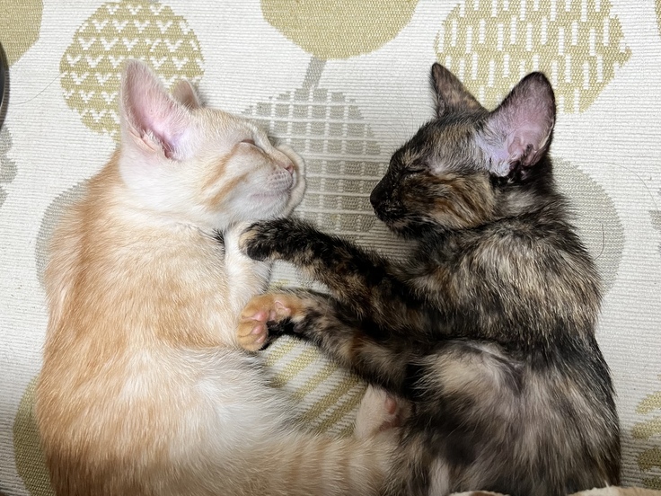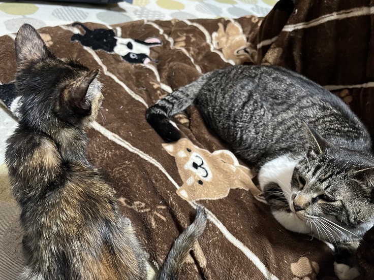避妊済みメスのムーちゃん(貫禄のある強気な女の子)には残念ながら現在のところ母性は目覚めず…3ヶ月経つ今でもシャーシャーフーフーパンチパンチ。一定の距離を保ちつつも、我が家に新しい姉妹メンバーが加入したことは認めてくれているようです。