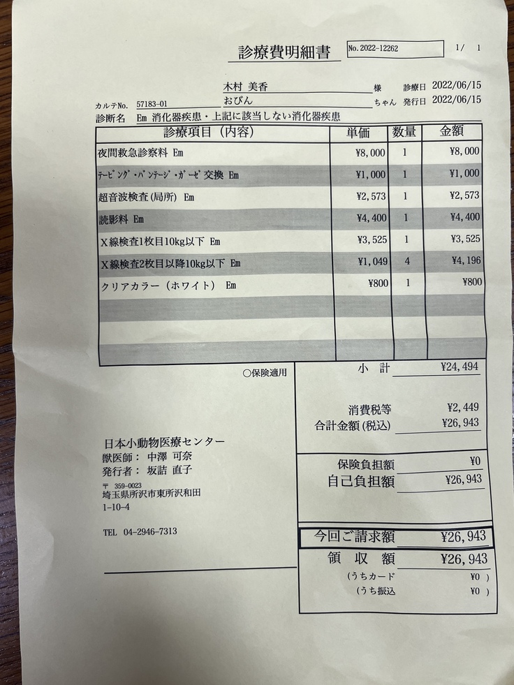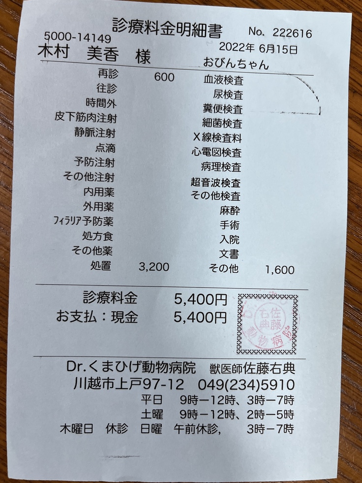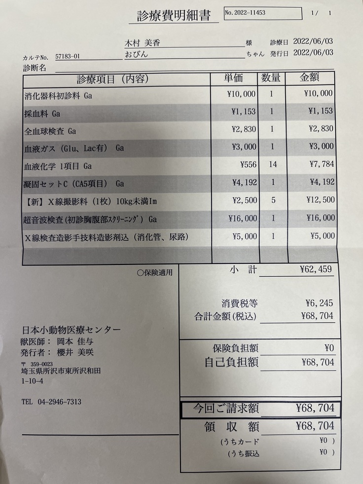 (本当は予約時の概算見積の時点で、検査診察処置費用のあまりの高さに驚き躊躇し一度キャンセルしてしまいました。でもオビンに治療の可能性があるならかけてみたい、と、結局直後にキャンセルをキャンセルし予定通り6月3日に初診日を迎えました)