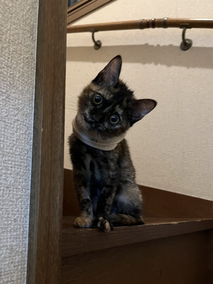 寝る時間になり、別々に寝かせるためチャビンたちみんなが2階にある娘の部屋に行ってしまったのを追いかけ途中まで頑張って階段を登ったオビン。私が声をかけるとこの顔…。きっと、なんでわたしは行っちゃいけないのって感じたと思います。