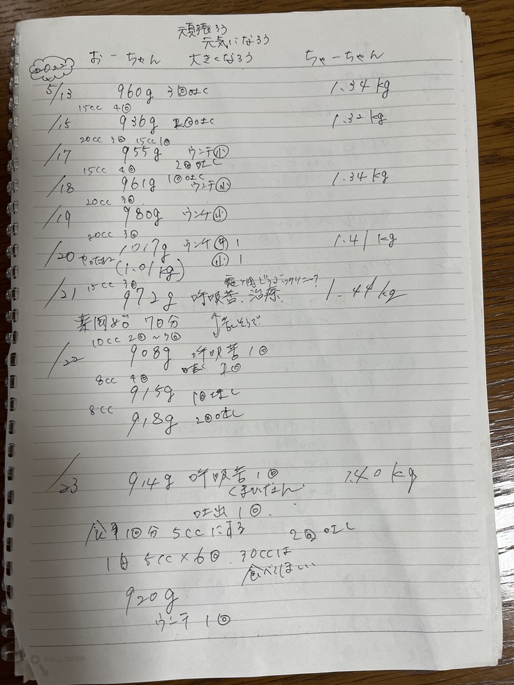 教えていただいた対処療法は、流動食をさらに水で薄め、それを少量ずつ立位で与え、食後は縦抱っこを15分以上行い、重力で胃に流し込ませるというものです。毎回少量しか与えられないので、オビンのお腹が満たされることはありません。
