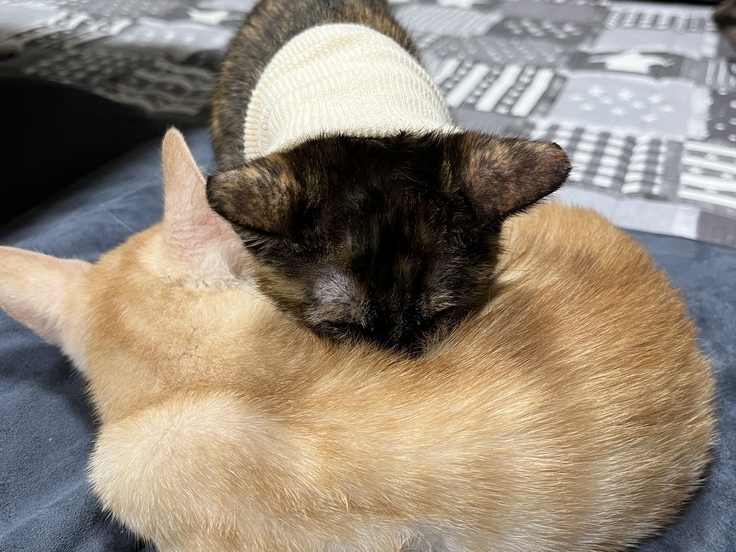 チャビンに甘えるオビン。術後当日の帰宅後はいつも以上にずっと離れませんてした。