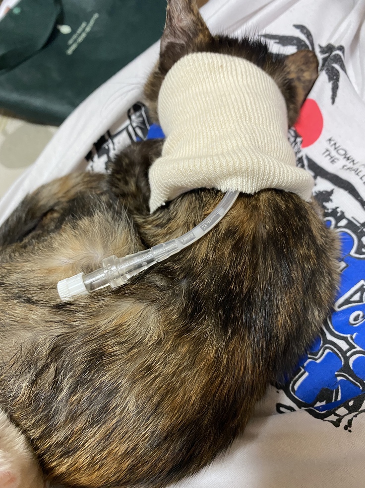 次回の内視鏡バルーン拡張までの間の、6月14日の深夜…日付はもう15日になっていた夜中の1時半頃、ゴポゴポゴポと小さな音が聞こえてきたので目を覚ますと、食道チューブがオビンの後頭部辺りで完全にちぎれ、オビンの胃からチューブを伝って胃の内容物が外に流れて出てオビンがびっしょりと濡れた状況でした。急いで寝ていた娘と息子を呼び、通常は空気が入らない状態に保っているチューブの先を娘に押さえてもらい、息子には他の猫たちのことを頼み、救急で病院に駆け込み処置をしていただきました。