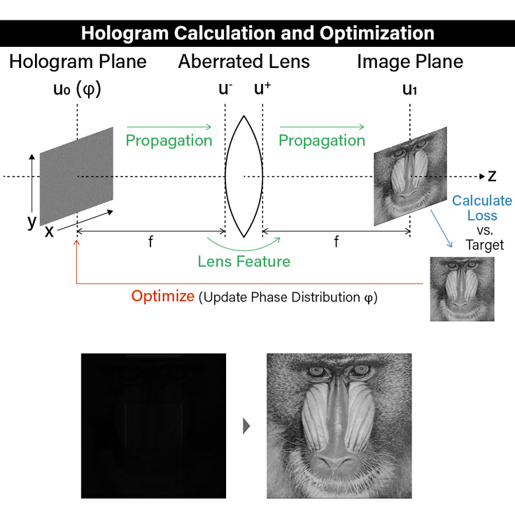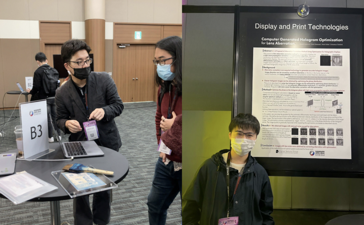 初めまして、学部3年の仲村和士です。私はXR技術に興味があり、学部1年次からデジタルネイチャー研究室に所属しています。XRの中でも視覚分野である光学ホログラフィのレンズ収差最適化に関する研究をしています。簡単に言うと、「歪みのあるレンズ(乱視など)を通してホログラムを見ると通常は像がゆがんだり、ノイズが発生したりするが、ホログラムを作るときにそれを織り込み補正して綺麗に見えるようにしたい!」という研究です。