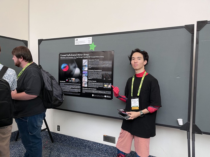 そうして今はその網膜投影ARを改良して日常利用可能なものにする研究を進めています。まさしく人類の更なる発展に関わる研究ですね。 今までの実績としては、まずARにとって重要な要素であるレンズ部分の透明度を上げる研究をしました。その論文をトップカンファレンスに位置付けられる国際学会ACM SIGGRAPH2023に採択され、今年の夏に参加してきました。そしてなんとその中でのコンペティションで学部生1位も取れました。感動です。