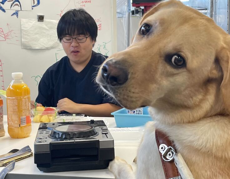 松村智也さんは社会人から一転、2022年4月に落合研究室(デジタルネイチャー研究室・DNG)に研究生として入学しました。 その後、視覚障害を抱えながらも筑波技術大学合格を果たし、現在大学院博士前期課程1年生です。盲導犬の「ジャガー」と一緒に日々研究に音楽に、忙しい学生生活を送られています。