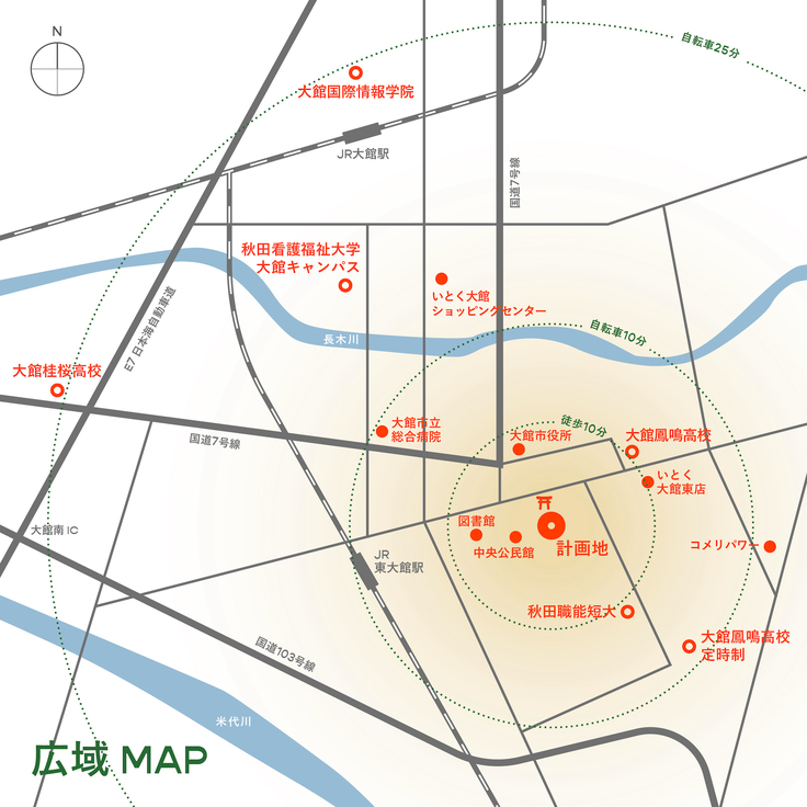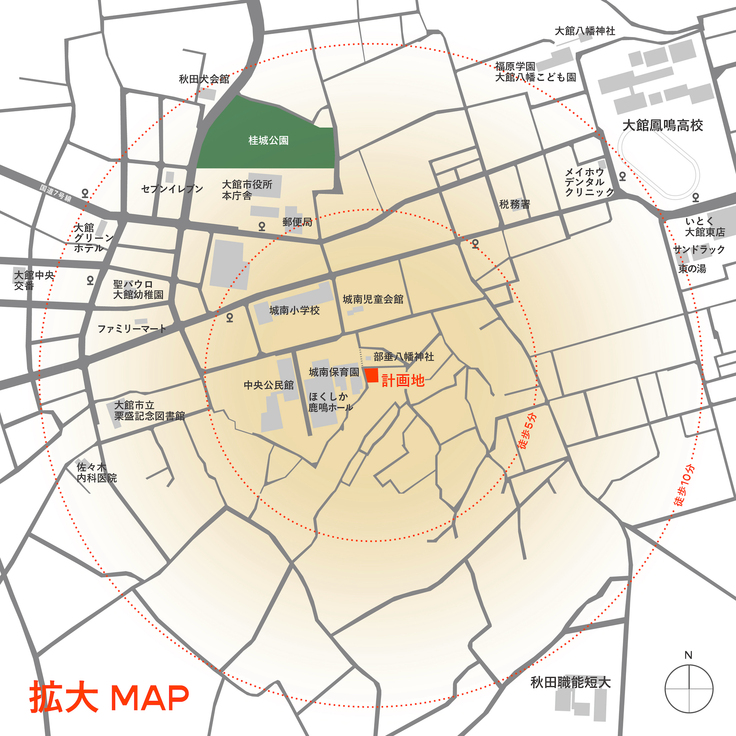 ・大館市の中心部に位置しており徒歩圏内には図書館・公民館・市役所がある場所に立地しています。