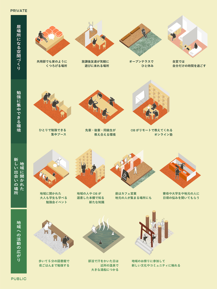 大館市桜町に学生寮を新設します。朝夕二食付き、勉強スペースを兼ね備え、学生たちが安心して勉強と部活に励める場所になります。朝と夜は学生のために、昼間の食堂はカフェとして地域に開き、学生だけでなく地域住民の憩いの場にもなります。年に数回開催する、学びイベントを通じて学生と地域住民が集まり、誰もが新しい知識や学びを行えるような場所になることを目指しています。