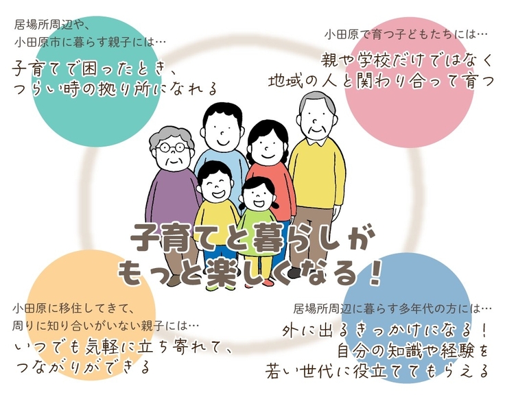 親子と、活動に関わってくださる地域の人が出会うことで、子どもも大人も小田原での暮らしの安心・楽しさにつながっています。