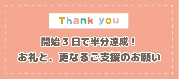 おかげさまで、6日(金)に開始してからの3日間で、目標金額の半分までご支援いただくことができました。