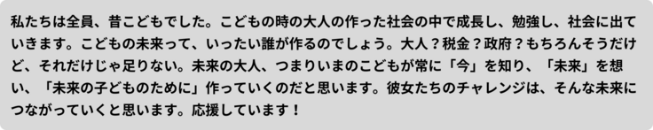 しかし、世の中全員が実際に現地を訪れて人々に話を聞くのは非現実的。では、私たちがその代表として現地を訪れ、見聞きしたことや肌で感じたこと、そこから変わったことをたくさんの人に伝えて行けばいいのではないか。
