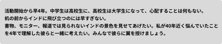 このTシャツの裏には、自分が画面越しに話をした笑顔の村の子供たち、インドのおじさん、工場のおねえさんたちが見えます。