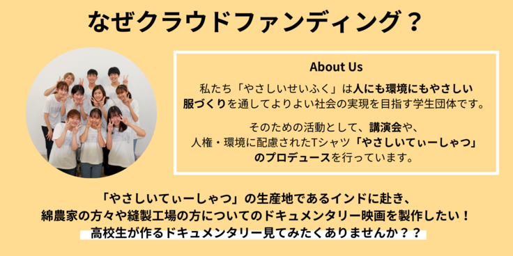 私たちは、人にも環境にもやさしい服づくりを通してよりよい社会の実現を目指す学生団体「やさしいせいふく」です。 講演会や、人権/環境に配慮したTシャツ「やさしいてぃーしゃつ」の販売などの活動を行っています。 現在、「やさしいてぃーしゃつ」を作った人に取材をしに、インドに行くためにクラウドファンディング実施中!