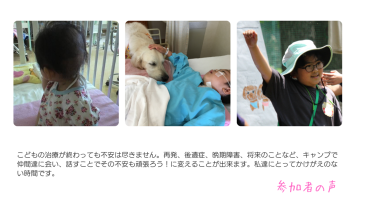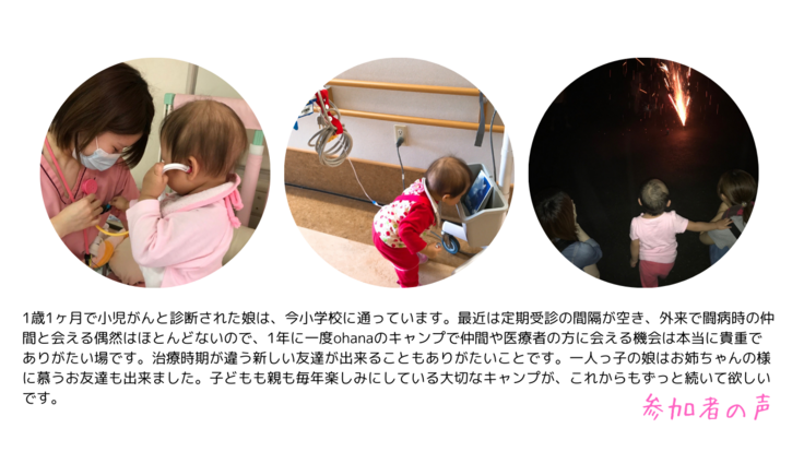 親は自分を責めることもありました。きょうだいは突然生活環境が変わりました。がんの子どもたち本人は、家族と過ごす時間を奪われ、いきなり病室で1人慣れない入院生活を送り、注射などの痛い思いをし抗がん剤の副作用に立ち向かっていきました。そして、そんな過酷な病室で支えてくれたのは医師、看護師、チャイルドライフスペシャリスト、保育士、ファシリティドッグ、院内学級の先生方など、たくさんの方の力で今こうして、私たちのこどもは生きていることができるのだと思います。私たちは、感謝を込めて医療者と一緒に行えるこのキャンプを楽しみにしています。どうぞ温かいご支援をよろしくお願いいたします。Ohana役員一同
