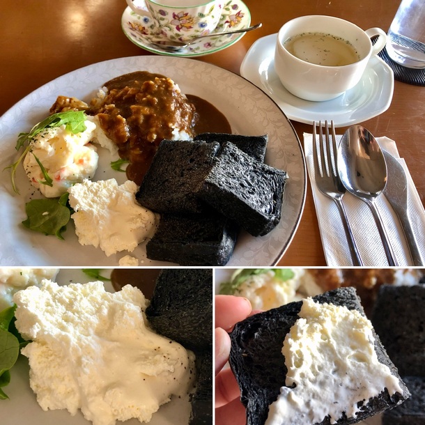 ランチプレートは、竹炭のパンとホイップバター、ポテトサラダ、そしてカレーライスかトマトソースペンネが選べる嬉しいセット♪これにスープとコーヒーが付いて800円とお値段も嬉しい!