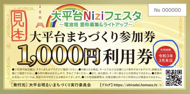 大平台まちづくり参加券1000円分。 大平台のお店でご利用いただけます。