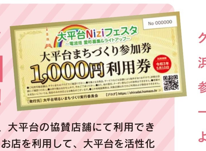 大平台まちづくり参加券1000円分。 大平台のお店でご利用いただけます。