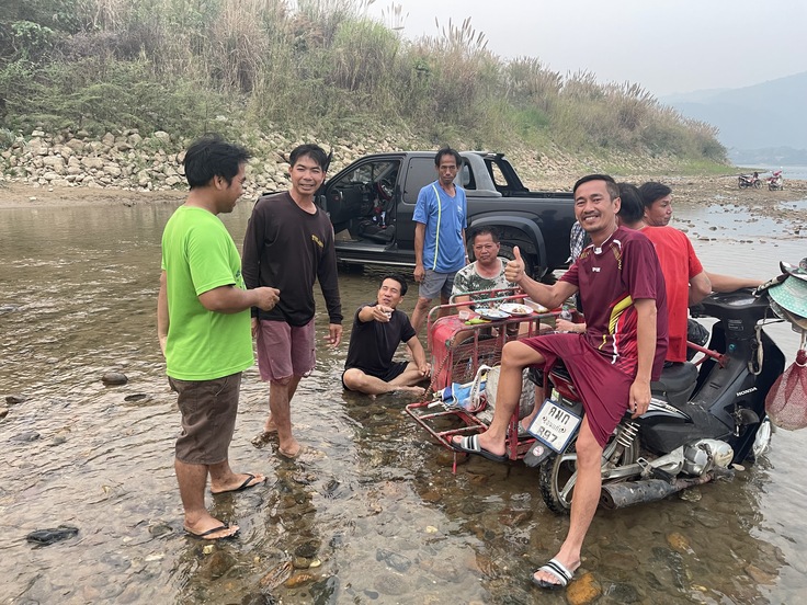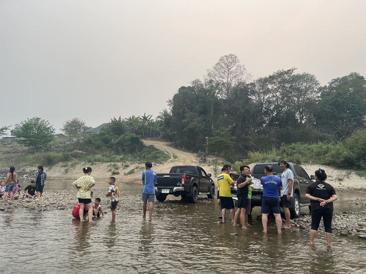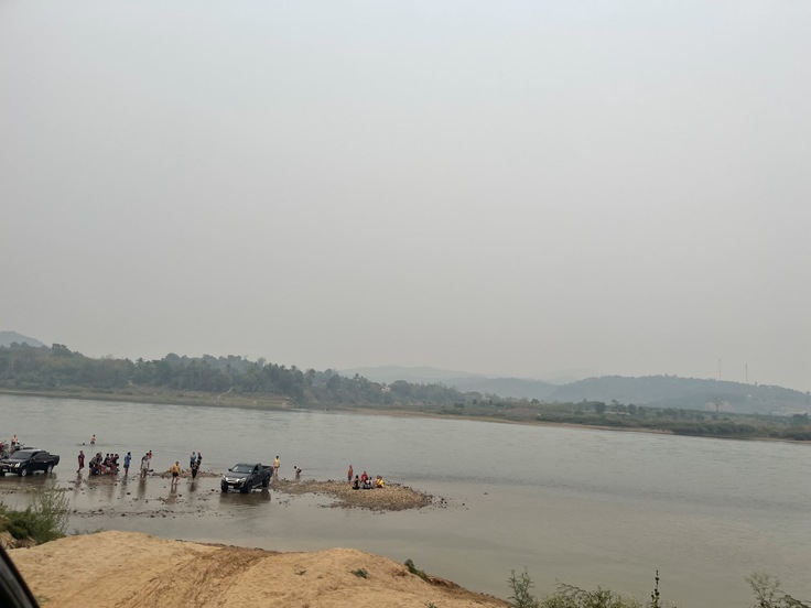 メコン川に車ごと入り込んで、音楽もかけて楽しそうです。