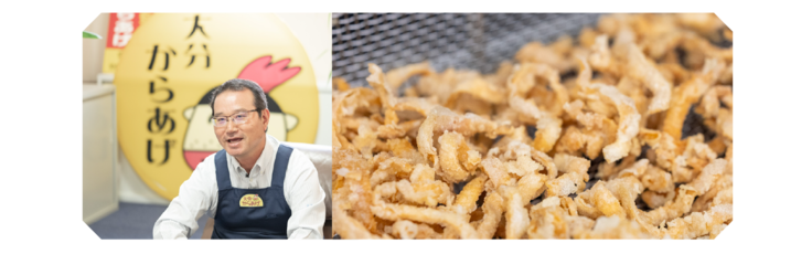 そこでその皮を揚げて商品にしたことが「とりかわサクサク揚げ」誕生のきっかけです。現在は食品ロスが起きないように最新のIT技術を活用することで在庫を最小限に抑えるなどの取り組みも行っています。製造工程はスーパーの時代と変わらず、一つ一つ手作業で心を込めて作っており、2007年からは大分トリニータ応援企業として賛同しています。