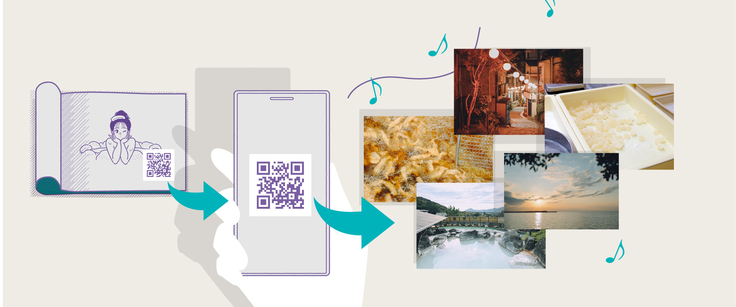 トラベルブックの各ページに記載されたQRコードをスマートフォンで読み込むと、旅気分をさらに高めてくれるスペシャル動画にジャンプ!それぞれの商品や大分の魅力を、耳と目でさらに楽しむことができる動画を手軽に楽しむことができます。