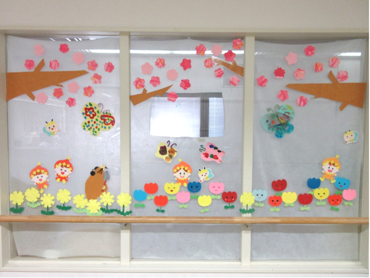 プレイルームの壁面(子どもの作品:さくら、ちょうちょう、もぐら)