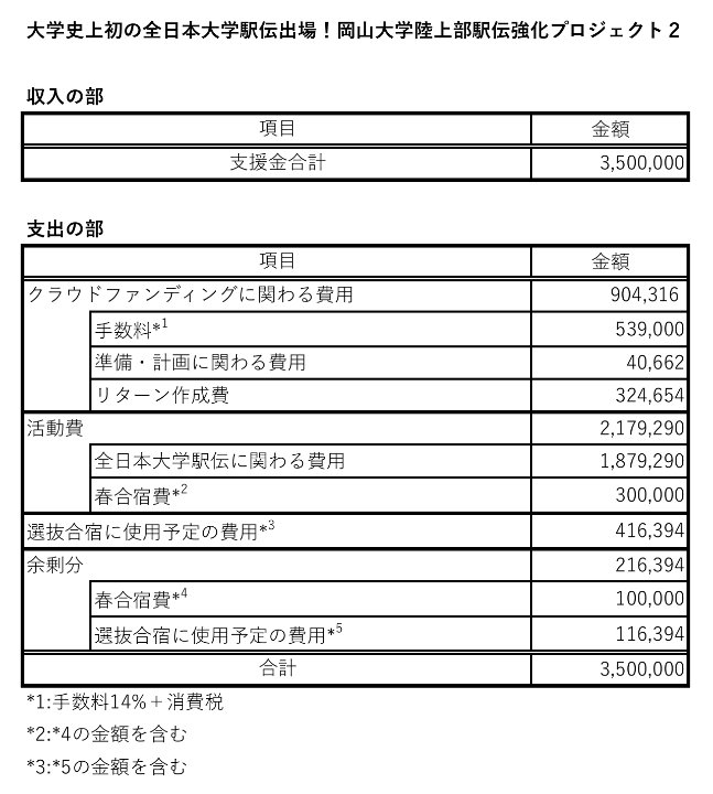 2024年10月9日に第一目標金額を1,800,000円として始まった本プロジェクトですが、10月21日に目標を達成し、最終的には3,500,000円という多くのご支援をいただきました。いただいたご支援は応援やサポートを含めた全日本大学駅伝のメンバーの宿泊費、交通費、そして春合宿の交通費として大切に使用させていただきました。また、夏に実施予定の選抜合宿の費用としても使用させていただく予定です。
