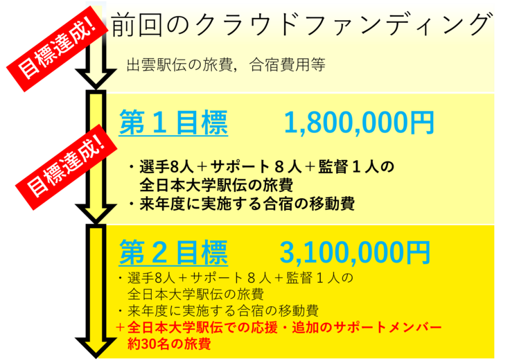 第一目標では、①全日本大学駅伝の計17名の旅費の負担(約¥1,000,000)、②温暖な合宿地で開催する春季強化合宿の移動費(¥200,000)を設定させていただきました。今回のネクストゴールでいただいた支援金は、全日本大学駅伝の応援・追加のサポートメンバー約30名の旅費(¥850,000)として、追加で充当させていただきます。