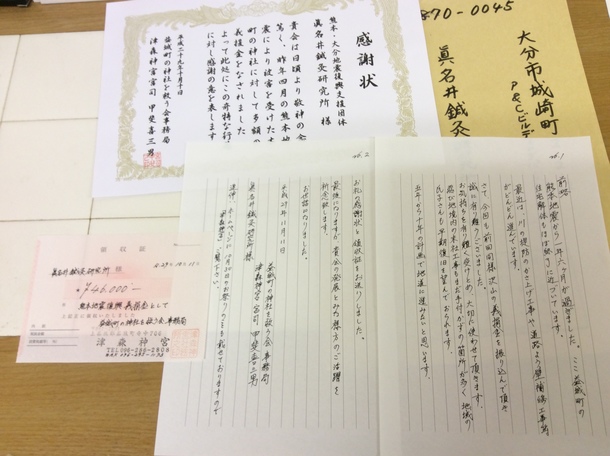 10月5日に、南阿蘇村役場と、益城町の神社を救う会へ、この半年でご協力いただいた寄附をお送りしました。
