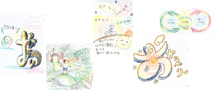 私たちの目指すこの情報サイトを通じて、学校が苦手な子どもたちや保護者と居場所等の活動が出会うとともに社会に認められて、子どもたちがすくすくのびのび自分らしく生きられることを願っています。絵描きのすゆみさんに描いていただいたメンバーの「おかえり」に対する思いのイラストもさまざま。「みんなちがってみんないい」それぞれの個性を大切にしてくれるたくさんの活動を、子どもやそのご家族とつないでいきたいです。(◆イラストレーターさんとの出会いは活動報告の中でご紹介します。)