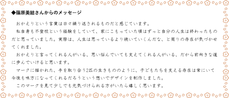 学校へ行きたくなくなって、おうちでずっと過ごしている。保護者の方と一緒なら少しずつ外出ができるようになってきた。休む時間も大切、甘える時間も大事。でもしばらくしたら、一人でもお出かけして外の世界でがんばって、無事に帰ってこられるように。おうちで待っていて安心して「おかえり」が言ってあげられるように。そんな将来への願いをこの「おかえり」という言葉に込めています。