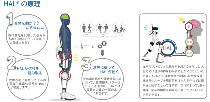 HAL®は、脳・神経・筋系の機能低下で身体を思うように動かせなくなった方の機能改善治療を行う世界初の装着型サイボーグです。人が体を動かそうとしたときに体表に漏れ出てくる微弱な「生体電位信号」を皮膚に貼ったセンサーで検出し、装着者の意思に従った動作を実現します。疾患などで身体が動かしづらくなってしまった方であっても、脳からの信号にもとづいたこのような運動を繰り返し行うことができるため、脳神経系の繋がりが強化・調整され、機能改善・機能再生が促進されます。