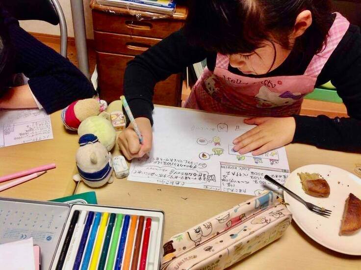 写真は、小3の女の子が、バナナケーキを作った後、そのレシピを書いているところです。とにかくカラフルで可愛いレシピです。その後、このお子さんは何度もバナナケーキを作ったそうですよ!