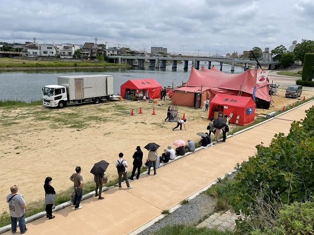 日本の演劇界に革新を起こしてきた唐十郎の劇団公演を10年ぶりに岡山開催。今回は京橋朝市実行委員会との共催事業として、旭川河畔・京橋河川敷に紅テントを設営して上演しました。当初4月開催の計画でしたが、コロナ禍の影響で6月に変更となりました。