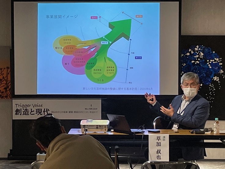 岡山ゆかりの劇場・美術・音楽のオピニオンによるトークセッション。岡山芸術創造劇場の劇場長・草加叔也さんは新劇場の全容を解説し、練馬区立美術館館長・秋元雄史さんは北陸3県連携の「Go for Kogei」を紹介し、東京都交響楽団芸術主幹・国塩哲紀さんは武満徹作曲・谷川俊太郎作詞の『系図』をビデオ上映により採り上げました。