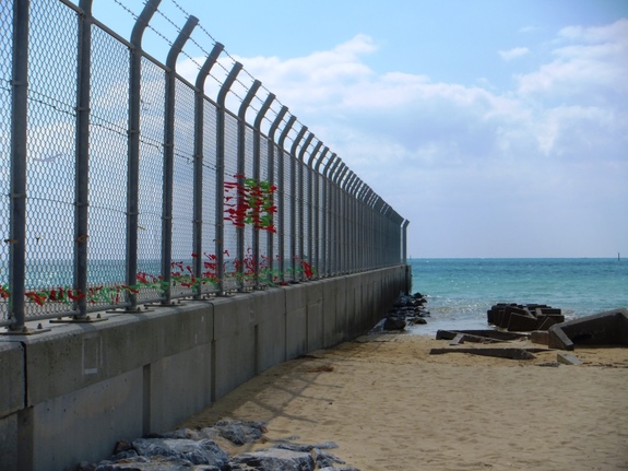(辺野古の美しい海に建設されてしまったフェンス。基地問題に関心を寄せる人たちがバナーやリボンを結んで環境保全と平和を訴えている。)