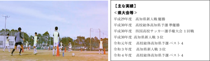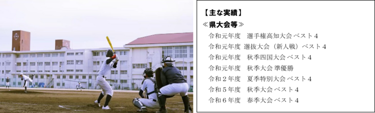 本校の運動部活動のなかでも多くの生徒が所属する野球部、ソフトボール部、サッカー部、陸上競技部については、過去に四国大会、全国大会出場等の実績があり、ソフトボール部は全国優勝の実績があり、生徒たちは全国出場、全国優勝を目標に日々、熱心に練習に励んでいます。