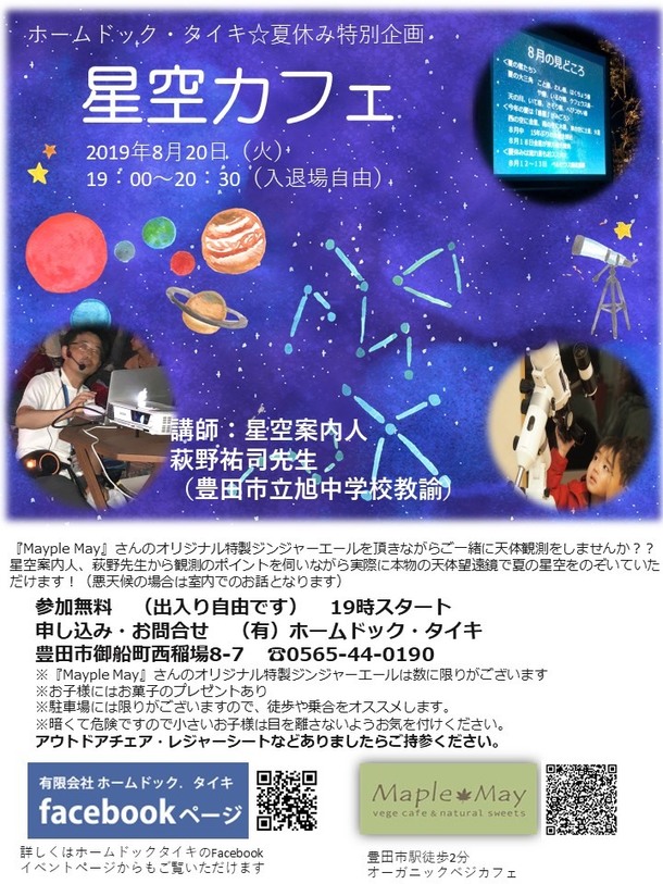 明日、8月20日18:30より、豊田市御船町にあるホームドックタイキ事務所&駐車場で開催される「星空カフェ@ホームドックタイキ」で星空案内を行います。豊田市役所東にあるベジカフェ『MapleMay』のオーガニックジンジャーエールも数量限定で提供されるとのこと…。