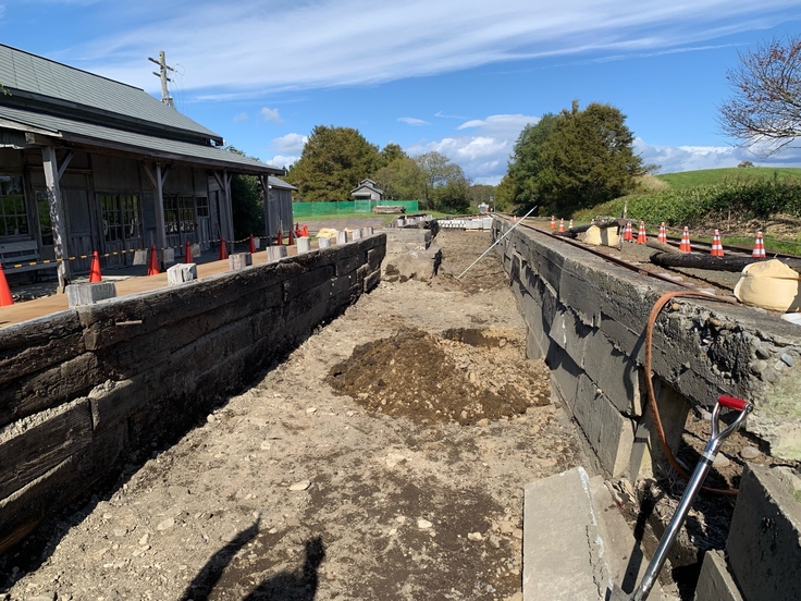 駅名標などは撤去し、電柱も取り外しました。このあとコンクリート製と枕木製の擁壁の撤去を行います。